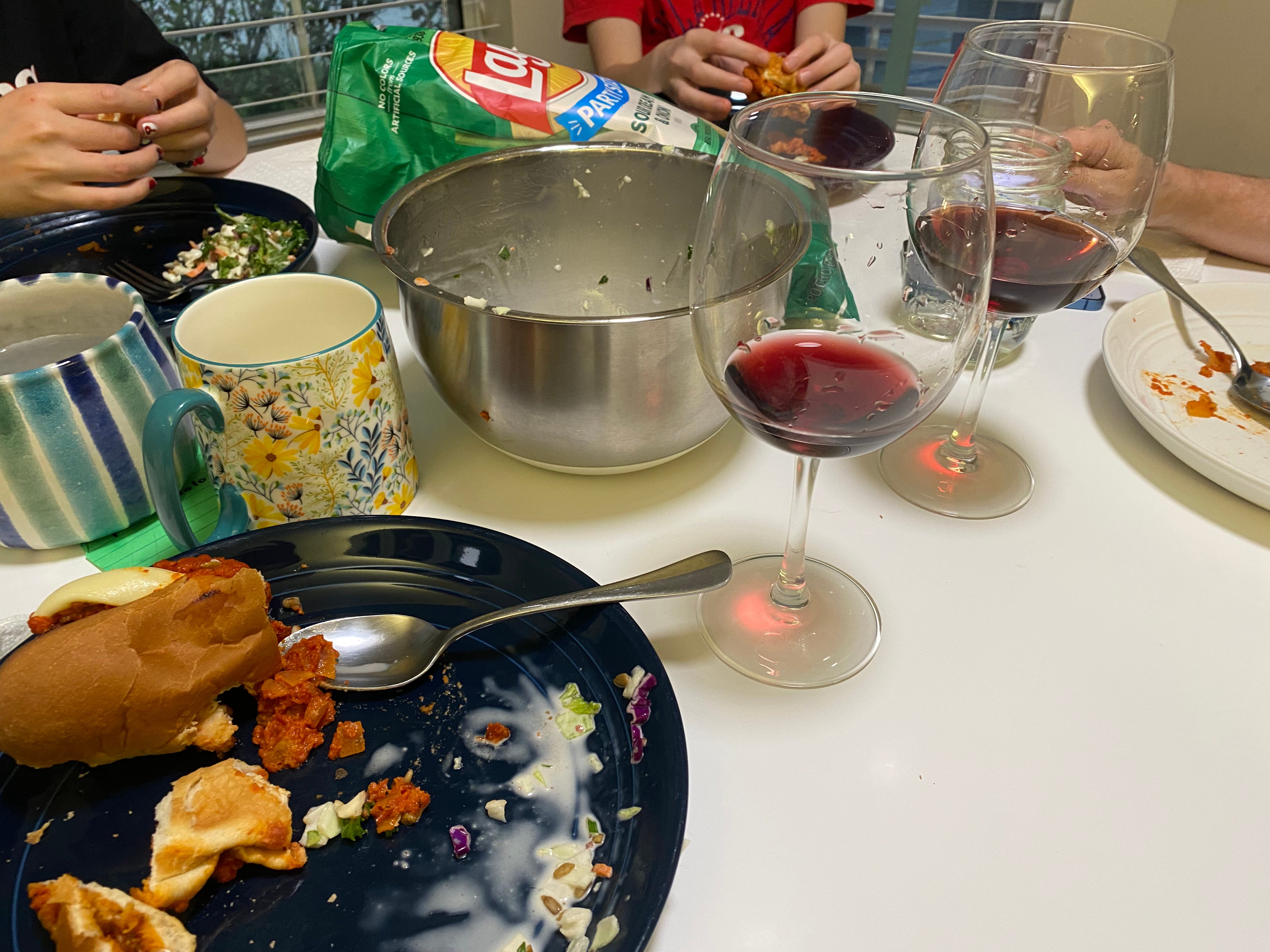 For dinner, I made a quick, homemade vodka sauce, and Costco provided breaded-chicken-breast fillets for some simple chicken-parm-esque sandwiches. (Also served: chips and a ready-made salad.)